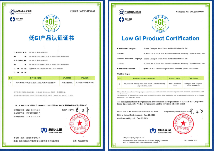 光友32年打造薯類方便主食健康品質(zhì):光友薯業(yè)32年來,專做健康薯業(yè),在中國(guó)乃至世界把紅薯、馬鈴薯做成一大健康主食產(chǎn)業(yè)。光友薯業(yè)歷經(jīng)32年來,光友綿陽(yáng)米粉低GI健康方便主食發(fā)布,是繼光友酸辣粉低GI健康方便主食后,又一個(gè)健康爆款產(chǎn)品上市。光友低GI健康薯類方便主食是經(jīng)光友薯業(yè)技術(shù)創(chuàng)新,經(jīng)國(guó)家權(quán)威檢測(cè)機(jī)構(gòu)營(yíng)養(yǎng)成分檢測(cè)和臨床試驗(yàn),取得低GI食品報(bào)告,由中國(guó)權(quán)威認(rèn)證機(jī)構(gòu)中檢科檢測(cè)后,為光友薯業(yè)頒發(fā)了光友綿陽(yáng)米粉低GI健康方便主食認(rèn)證證書,這是線上線下各位領(lǐng)導(dǎo)、嘉賓、朋友,關(guān)心支持光友32年來共同取得的成果!