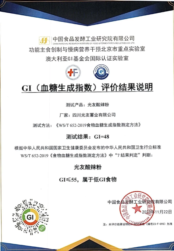 4月23日訊:近日,光友薯業(yè)收到來自中國食品發(fā)酵工業(yè)研究院GI營養(yǎng)工作室的喜訊,光友薯業(yè)生產(chǎn)的明星產(chǎn)品——光友酸辣粉成功通過中國食品發(fā)酵工業(yè)研究院GI國際聯(lián)合研究與測試實驗室標準化GI測試流程,被認證為低GI食物。