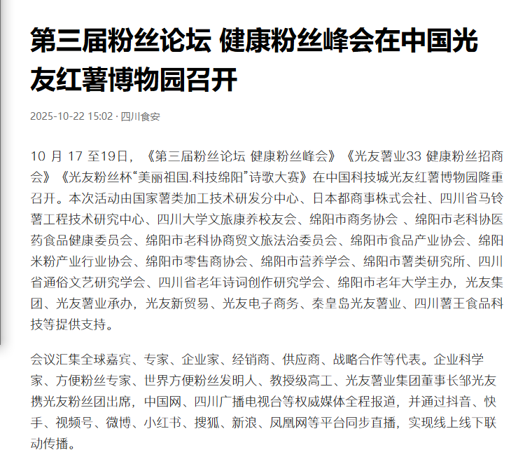 轉(zhuǎn)載四川食安今日頭條-第三屆粉絲論壇 健康粉絲峰會(huì)在中國光友紅薯博物園召開